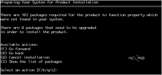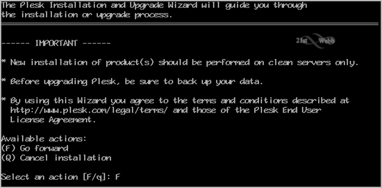 Step 3: In "Select the Installation type for Plesk" enter "F" or, in case you are familiar with what you are doing, chose the other option - installing all components by entering "2" (without the quotes) and press "F'.